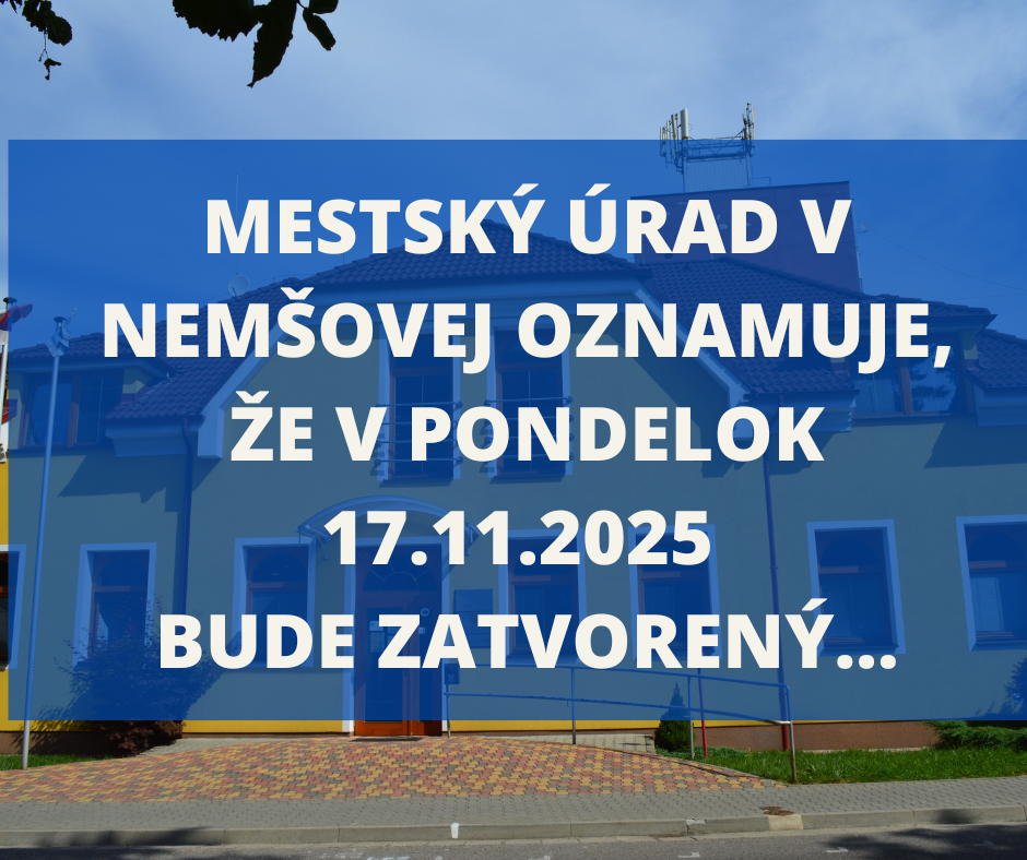 Mestský úrad v Nemšovej oznamuje, že v pondelok 17.11.2025 bude zatvorený...
