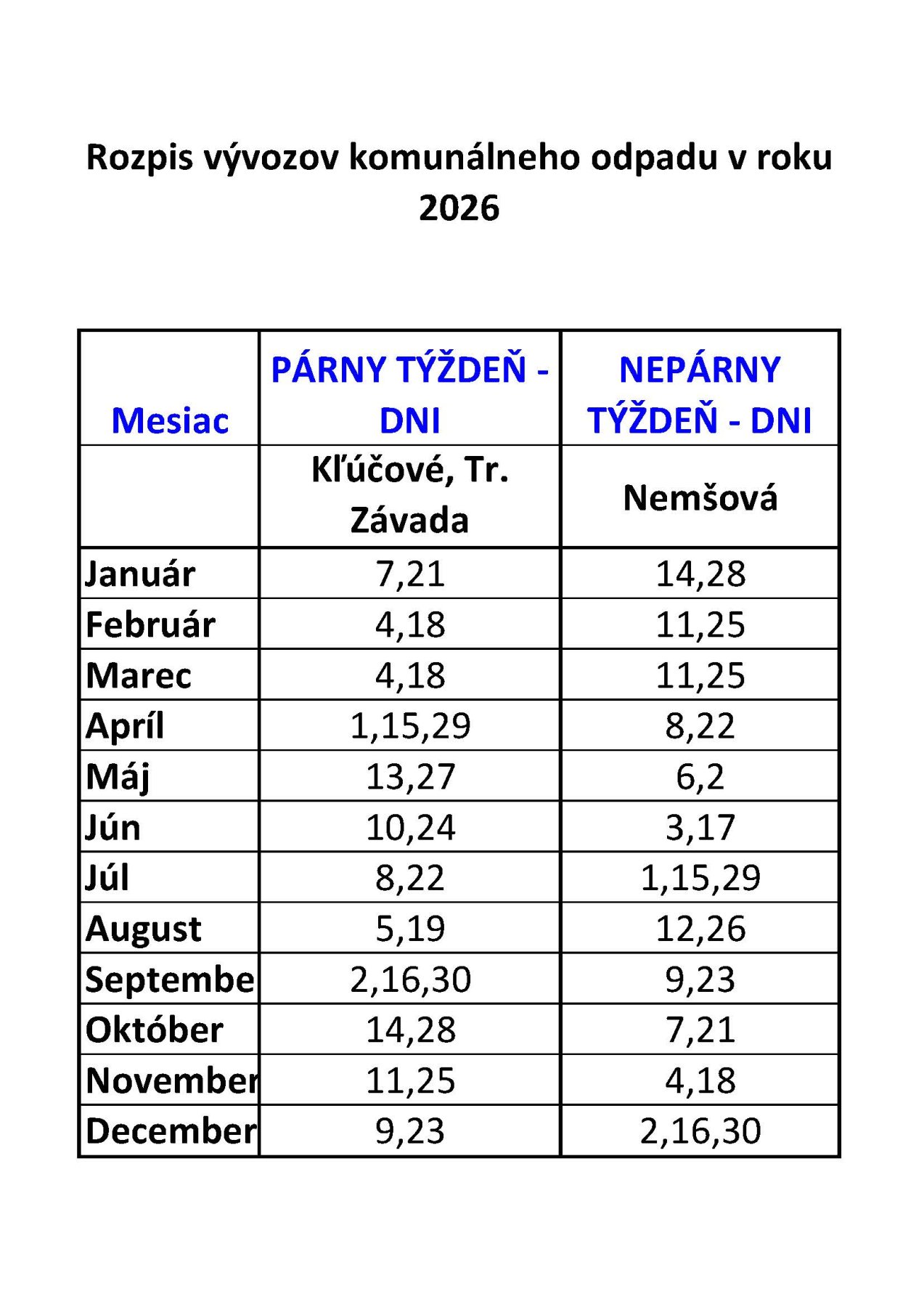 - Nepárny týždeň - streda - 120 l, 240 l nádoby Nemšová – rodinné domy a 1 100 l nádoby pri bytových domoch.